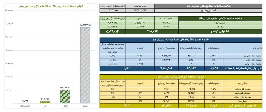 همچنین روز گذشته ۴۰۳ میلیون واحد صندوق های مبتنی بر طلا به ارزش ۲.۸ همت معامله شد.