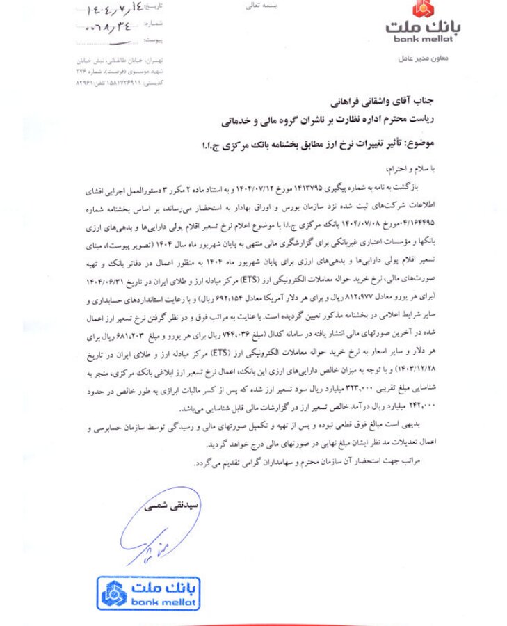 متن کامل نامه بانک ملت که در سامانه کدال منتشر شده، به شرح زیر است: