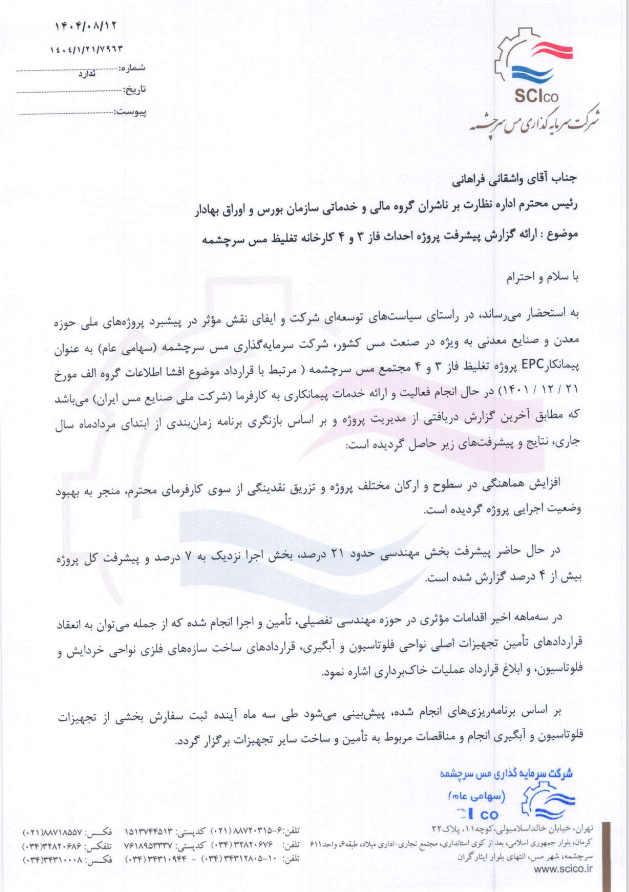 شرکت سرمایه گذاری مس سرچشمه با نماد«سرچشمه» در اطلاعیهای از پیشرفت پروژه احداث فاز ۳ و ۴ کارخانه تغلیظ مس سرچشمه خبر داد.