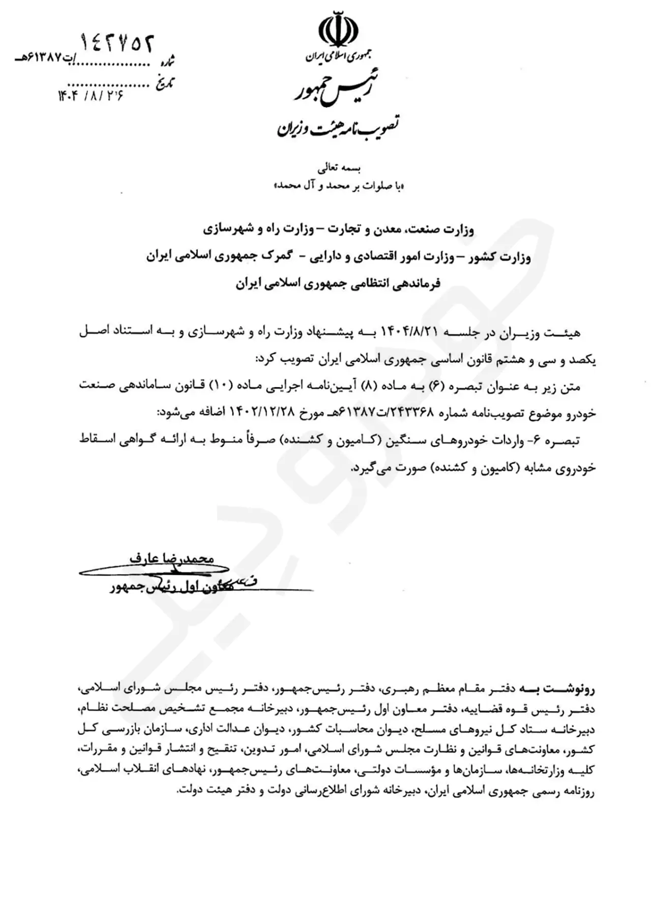 تصویبنامه هیئت وزیران با موضوع الحاق یک تبصره به ماده ۸ آئین نامه اجرایی ماده ۱۰ قانون ساماندهی صنعت خودرو از سوی محمدرضا عارف معاون اول رئیس جمهور ابلاغ شد و از این روی، ساز و کار واردات انواع خودرو های سنگین، اعم از کامیون و کشنده به کشور، قرار است با تغییراتی همراه باشد.