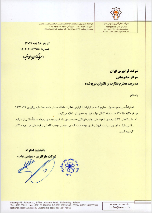 شرکت مارگارین با نماد«غمارگ» در اطلاعیه شفاف سازی اعلام کرد: علت کاهش ۱۷ درصدی نرخ فروش روغن خوراکی_فله در مهر نسبت به شهریور بهدلیل شرایط فروش رقابتی بازار و اجرای سیاست فروش نقدی بوده است.