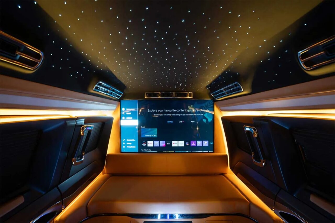 با باز شدن درها، دنیایی از تجمل آشکار می‌شود. کابین این لندکروزر بیشتر به یک سالن استراحت یا سینمای خصوصی شباهت دارد. فضای داخلی با چرم قهوه‌ای روشن، تریم چوب و تزئینات کرومی پوشانده شده است. دو صندلی راحتی عظیم با زیرپایی‌های بازشونده در عقب کابین قرار گرفته‌اند و روبروی آن‌ها یک کاناپه پهن قرار دارد؛ اما نقطهٔ اوج این طراحی، سقف کهکشانی با الهام از رولزرویس و یک تلویزیون غول‌پیکر است که فضای بین راننده و سرنشینان را کاملاً جدا می‌کند. پرده‌های برقی، نورپردازی و کف‌پوش ضخیم، حسی از آرامش و تجمل را به سرنشینان هدیه می‌دهند.