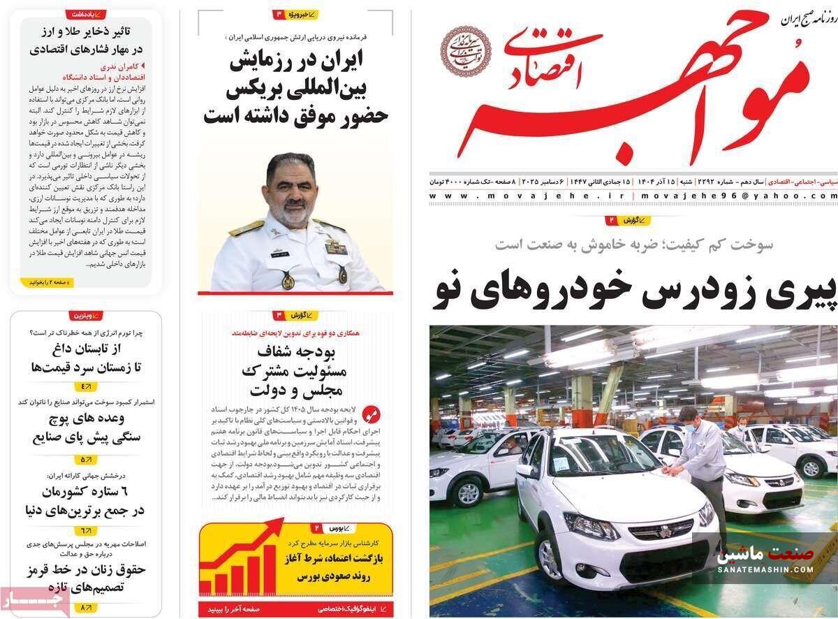 صنعت ماشین: صفحه نخست روزنامه های اقتصادی 15 آذر 1404 در صنعت ماشین منتشر شد.