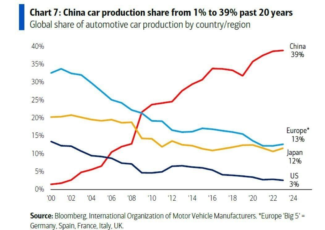 آمارها نشان میدهد سهم تولید خودرو چین در طول ۲۰ سال از ۱ درصد به ۳۹ درصد تولید جهانی رسیده است،به عبارت دیگر در حالی که سهم چین از بازار خودروی جهان در سال ۲۰۰۴ کمتر از ۱ درصد بوده است در سال ۲۰۲۴ این سهم به ۳۹ درصد رسیده است؛ این در حالی است که سهم ایالات متحده،ژاپن و اروپا در سال ۲۰۰۰ به ترتیب از صنعت خودروسازی دنیا ۱۵ درصد،۲۰ درصد و ۳۳ درصد بوده است اما باگذشت ۲۴ سال صنعت خودروسازی چین؛ اروپا، آمریکا و ژاپن را پشت سر گذاشت و حالا به یکی از بزرگ ترین خودروسازهای دنیا تبدیل شده است.